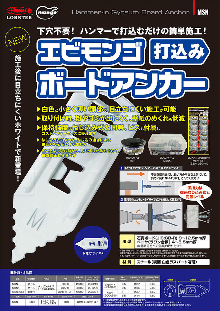 ☆LOBSTER/ロブテックス エモンゴ 打込みボードアンカー ケース 200組入 MSNK (表面 白色ラスパート処理)
