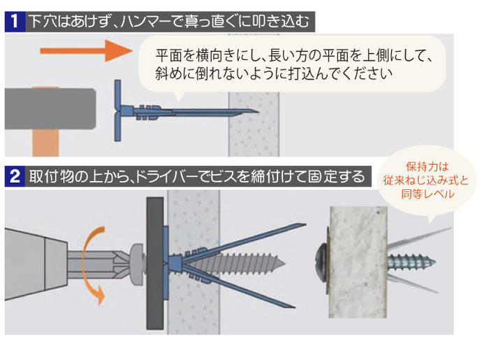 【特長】 ●白色と小さく薄い頭部で、目立ちにくい施工が可能 ●取り付け時、粉やゴミが出にくく、壁紙のめくれも低減 ●保持強度がねじ込み式と同等、ビスも付属しコストパフォーマンスに優れます ●ねじ込み式のような、ねじ込み過ぎによる供回りの心配はありません ●ビスをねじ込む前なら、取り外した跡も小さく、位置修正も容易です 【仕様】 ●200組入 ●全長:29.5 mm ●頭部径:φ10.9mm ●適合ネジ径:φ3.5〜5.0 タッピングネジ 適合 ●ネジ長さ:取付物+20mm以上 【材質】 ●スチール(表面 白色ラスパート処理) 【付属品】 タッピングネジ(トラス)4×25 【納期】メーカーに在庫があれば、約3〜4日(営業日)で出荷いたします。