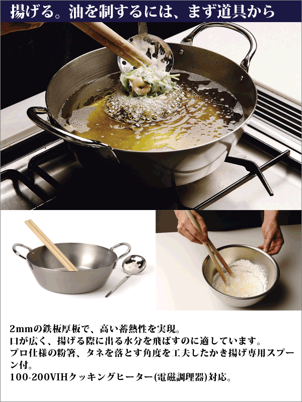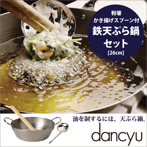 送料無料 【●日本製】 dancyu ダンチュウ 鉄天ぷら鍋セット26cm (鉄天ぷら鍋26cm 粉箸 かき揚げスプーン セット)/ ガス火 IH対応 鉄製 両手 鍋 天ぷら鍋【RCP】【CP】